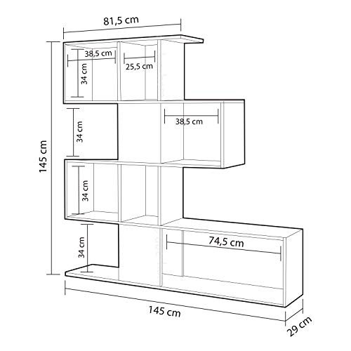 Dimensioni della libreria a zig zag: altezza 45 cm, larghezza 145 cm, profondità 30 cm
