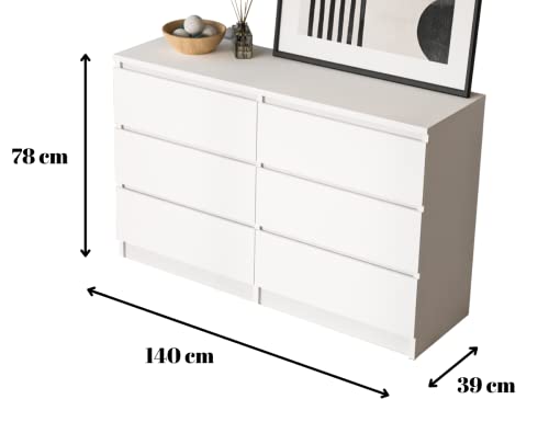 Caratteristiche tecniche: lunghezza: 140 cm, altezza: 78 cm, profondità: 39 cm, numero cassetti: 6 cassetti, spessore piano: 18 mm, materiale: pannello in laminato.