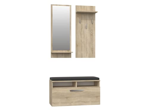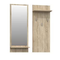 Dimensioni appendiabiti/specchio: profondità: 16 cm x larghezza: 35 cm x altezza: 90 cm. Dimensioni armadio: profondità: 35 cm x larghezza: 85 cm x altezza: 46 cm.