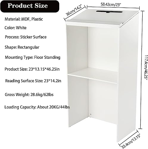 【DESIGN ATTENTO DEI DETTAGLI】 L’altezza di 46,25 pollici offre un migliore supporto posturale quando si è in piedi e previene l’affaticamento della schiena. L’ampia superficie di lettura (23 * 14,2 pollici) è dotata di una libreria, che offre spazio sufficiente per posizionare in sicurezza laptop, notebook e carta per ottenere una presentazione fluida.