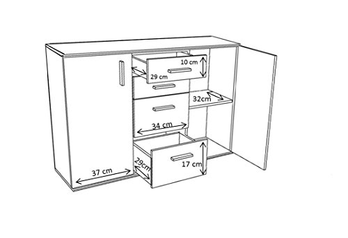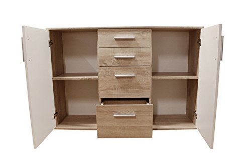 Comò, dotato di 2 ante con 1 ripiano all’interno ciascuna, 2 cassetti piccoli e 2 cassetti grandi, in stile moderno ed elegante. Questo sideboard offre molto spazio di archiviazione, una soluzione salvaspazio perfetta per ogni abitazione. La cassettiera di media grandezza con suo aspetto naturale, arricchisce ogni camere da letto, soggiorno o zone d’ingresso. Le sue ante in bianco creano un bel contrasto forte con colore del corpo, facile da abbinare ad altri stili già presenti in casa.