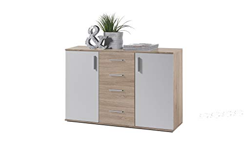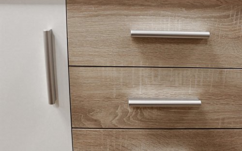 Materiale: Legno laminato di quercia Sonoma con 2 ante in laminato di colore bianco, maniglie in plastica sintetica con ottica di alluminio, stabile e resistente.