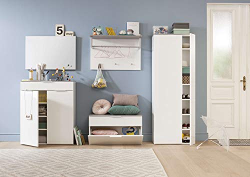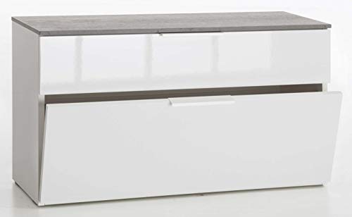 Panca da guardaroba con 1 cassetto ed 1 anta a ribalta in stile moderno ed elegante. Offre molto spazio per scarpe o altre cose nel area d’entrata. Il pannello superiore in grigio cemento d’imitazione crea un bel contrasto con il bianco lucido. Appartiene ad una serie di mobili da ingresso e da soggiorno, che possono essere acquistati separatamente a secondo lo spazio disponibile e necessità.