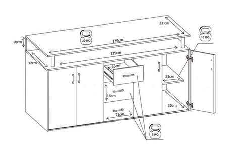 Dimensioni totali comprensive del suolo. L x A x P 139 x 90 x 34 cm, superficie superiore fino a 15 kg.