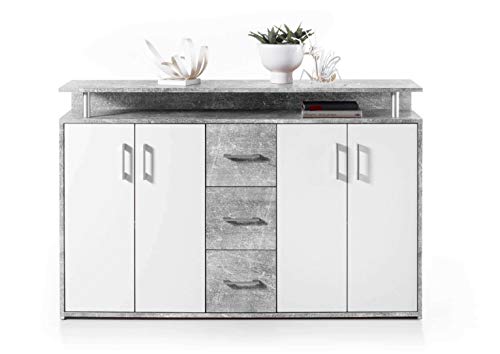 Comò moderno con 4 ante a battente, 3 cassetti ed un ripiano superiore, all’interno si trova 1 ripiano dietro le ante doppie per lato, che offrono molto spazio per abbigliamento o altre cose. La credenza è dotata anche di 1 ripiano aperto per giornali o libri, inoltre c’è spazio per oggetti decorativi sul piano superiore, che è sostenuto da 2 colonnine in ottica d’alluminio. Questo mobile da ingresso dal design elegante è anche adatto per soggiorno, salotto o camera da letto.