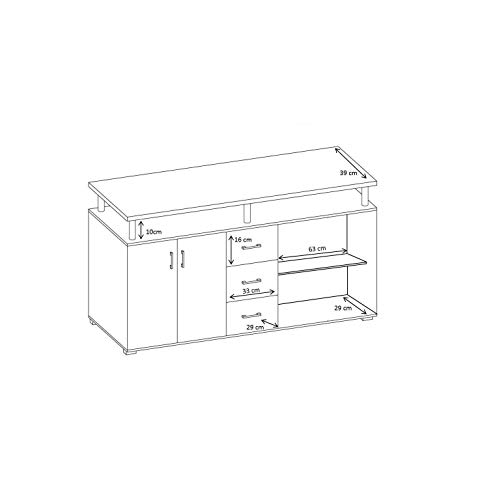Comò spazioso, dotato di 3 cassetti e 4 ante con 1 ripiano interno per lato, inoltre un ripiano superiore tenuto da 6 colonnine in un design moderno ed elegante. Questa credenza offre molto spazio di archiviazione ma anche posto per oggetti decorativi sopra, ideale per l’ingresso, stanza da letto o in soggiorno. Le ante in bianco creano un contrasto forte con il legno laminato di quercia, che ha un aspetto molto naturale e invitante. Suo stile instancabile si lascia anche bene abbinare ad altri.