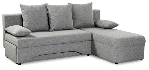 Divano ad angolo, con funzione letto e cassettone integrato, in stile elegante. Il divano è subito trasformabile in un letto e la biancheria si può riporre nel cassettone. Comodamente imbottito, è dotato di 3 cuscini grandi per lo schienale e 2 cuscini sfusi braccioli sui due lati. La penisola è montabile su entrambi i lati. Questo divano è rivestito su tutti i lati e posizionabile anche nel mezzo del soggiorno. Il grigio si lascia facilmente abbinare ad altri mobili grazie al suo tono neutro.