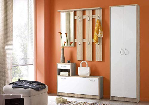 Armadio da ingresso, dotato di 2 ante a battente con 4 ripiani all’interno, dal design semplice e moderno. Questo armadio alto è poco ingombrante, che lo rende ideale anche per appartamenti meno spaziosi o monolocali. È adatto per ogni area d’entrata, perchè offre molto posto per abiti o scarpe. Per avere ulteriore spazio di stivaggio, abbiamo anche un guardaroba compatto nel nostro assortimento, che stà in perfetta armonia e può essere acquistato separatamente.