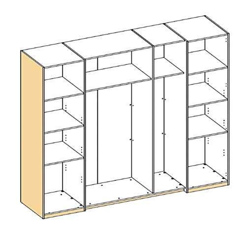 Armadio con 2 ante scorrevoli e 2 a battente, in stile moderno ed elegante, perfetto per ogni camera da letto. Dietro le 2 ante scorrevoli si trovano 2 aree, di qui quella a sinistra è piu larga di quella a destra, ma entrambi allestite con 1 ripiano ed 1 bastone appendiabiti. All’interno delle 2 ante a sinistra e destra ci sono altri 3 ripiani per lato. L’armadio offre molto spazio per abbigliamento e grazie alla misura poco ingombrante, è adatto anche per camere meno spaziose o monolocali.