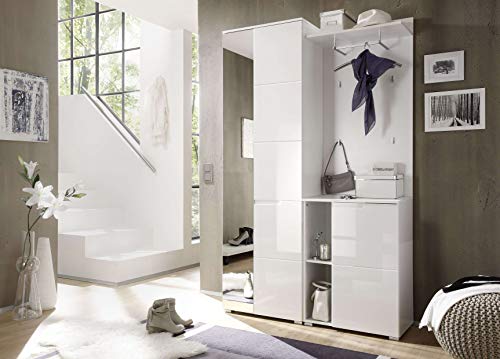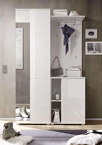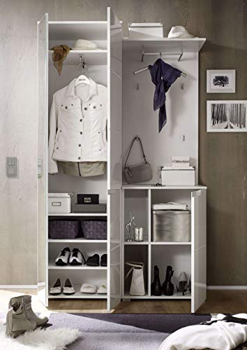 Guardaroba completo, comprende un armadio con specchio, pannello da parete con appendiabiti e ganci, inoltre c’è un mobile con anta e due vani aperti. Questo mobile da ingresso multifunzionale e compatto offre molto spazio per abbigliamento, borse e scarpe. È facile da abbinare ad altri mobili moderni ed eleganti, é poco ingombrante e arrichische ogni area d’entrata col suo aspetto lussuoso.