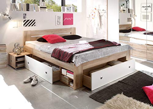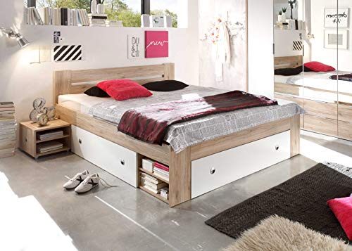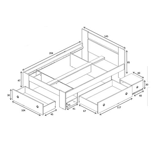 Fusto di letto misura francese con 2 comodini inclusi e 3 cassettoni integrati, dal design moderno e giovanile. Rete a doghe e materasso NON sono compresi e possono essere acquistati separatamente (vedi p.e. art. B07539C1SG e B07547HXBZ). Il letto offre un ampio spazio di distesa di 140×200 cm ed è molto comodo. Allo stesso tempo è molto salvaspazio e offre tanto posto per riporre oggetti o biancheria da letto. Ideale per camere da ragazzi o adolescenti, anche in stanze meno spaziose.
