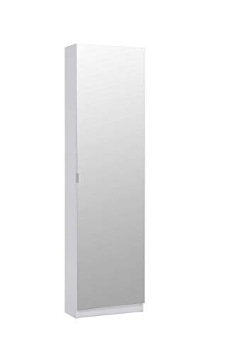 Materiale: Corpo in legno laminato di colore bianco, anta con specchio, vani in stoffa scura, maniglia in plastica sintetica con ottica di alluminio, molto stabile e resistente. Porta montabile a destra o sinistra.