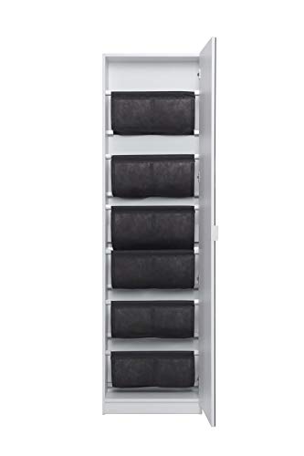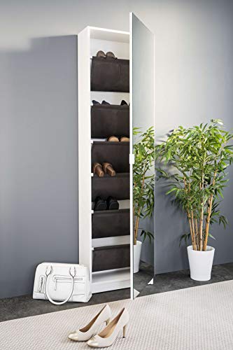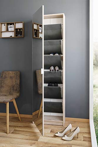 Armadio da ingresso con 1 anta specchiata, con 6 vani interni per riporre scarpe e stivali, dal design moderno e molto elegante. L’anta con specchio insieme con il colore bianco arricchisce ogni zona d’entrata e rende questo mobile molto facile da integrare nello stile di arredamento già presente. Grazie alle misure poco ingombranti è anche ideale per appartamenti meno spaziosi, corridoi o monolocali. I 6 scompartimenti per appendere ca.12 paia di scarpe, molto funzionali e salvaspazio.