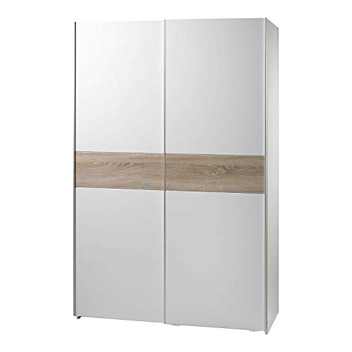 Armadio ad ante scorrevoli, in stile moderno e semplice. Le due ante hanno un decoro in laminato di quercia Sonoma, che crea un bel contrasto con il corpo bianco del mobile. All’interno offre molto spazio per abbigliamento, grazie ai 2 bastoni appendiabiti e ai 2 ripiani superiori. Suo design elegante arrichisce ogni camera e può essere abbinato ad altri mobili moderni, come il letto “Pinturas”, che si armonizza perfettamente in termini di stile e materiali (vedi articolo: B0777J2B).