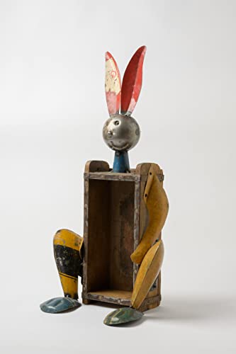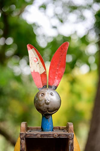 RECYCLED MATERIAL & IDEAL SIZE: Made from 100% recycled parts and scrap metal, this decorative Recycled Iron RABBIT WITH BRICK MOULD BOTTLE HOLDER Figurine 10x7x21 (LWH) inches