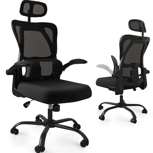 HOLLUDLE Sedia da Ufficio Ergonomica con Schienale Pieghevole, Sedia da Scrivania con Sedile Allargato (52 CM), Braccioli Ribaltabili e Supporto Lombare in Rete Sedia da Lavoro Girevole, Bianco