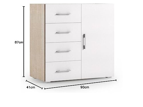 CREDENZA VIOLETTA -Mobile buffet a 1 anta e 4 cassetti, Madia da soggiorno, Armadietto multiuso con ripiani, 100% Made in Italy, Cm 90x41h87, Bianco e Rovere
