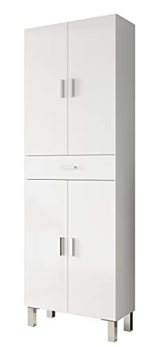 Mobile a quattro ante e un cassetto nella parte centrale, interamente di colore bianco lucido, è la soluzione ideale per arredare in modo pratico e funzionale il vostro bagno