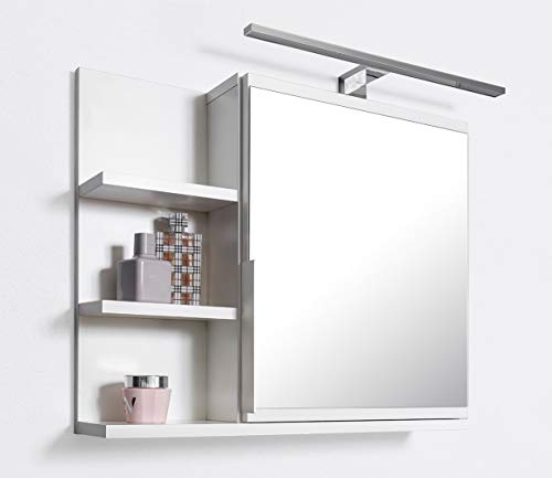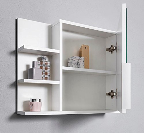 Dimensioni 60 x 50 x 14 cm (larghezza x altezza x profondità); realizzato in truciolato da 18 mm, cristallo e specchio riflettente naturale da 40 x 44 cm (larghezza x altezza).