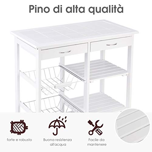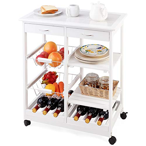 Ampio spazio di archiviazione – Il nostro carrello da cucina ha due portabottiglie, due ripiani in legno, due cestini di metallo, fornire molto spazio per posizionare oggetti, puoi mettere vino rosso, tazze, scodelle, piatti, bacchette, ecc.