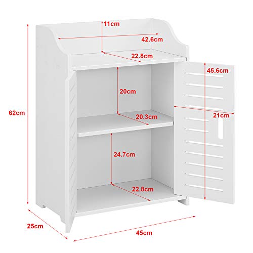 Misure: – completo (A x La x P): 62 x 45 x 25 cm – ripiano superiore (A x La x P): 11 x 42,6 x 22,8 cm – anta (A x La): cadauna 45,6 x 21 cm