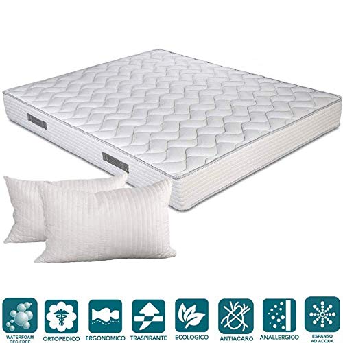 ✅ Materasso Matrimoniale 160×200 in Waterfoam alto 20 cm, Water Foam ad alta resilienza, poliuretano in schiuma espansa ad acqua, Ecologico. Ideale per ogni Rete o Letto Matrimoniale, Fodera colore Bianco in Offerta con Coppia Cuscini Letto GRATIS in Fiocco Memory Cervicale del valore di 60 € !