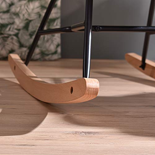 [MATERIALE] – La poltrona è dotata di comodi sedili imbottiti e sono rivestiti in modo uniforme con tessuto a trama in poliestere. E il supporto in acciaio distintivo è rifinito con verniciatura a polvere nera. La base per il dondolo è realizzata in legno di faggio.