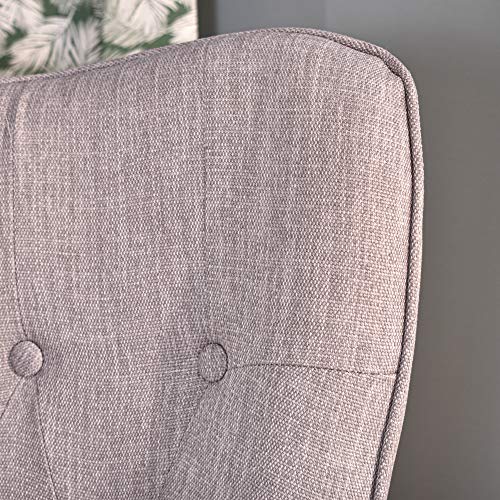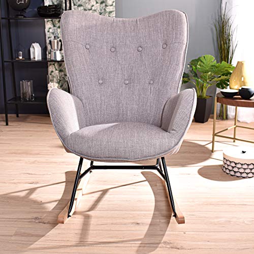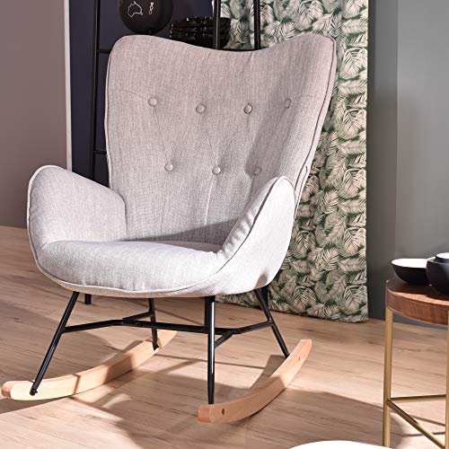 [CARATTERISTICHE] – POLTRONA. Questo prodotto è definito dal suo vibrante rivestimento grigio e dai sottili piedini in metallo nero. Con supporti in acciaio resistente e una base in legno di faggio, questo pezzo è una svolta divertente su una sedia a dondolo classica. Braccioli per un maggiore comfort.