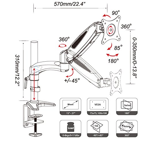 Extra forte morsetto installato sul dispositivo, per eccellente stabilità e sicuro. Il piedistallo permette, su un monitor di pesare fino a 8 kg. Monitor standard per casa