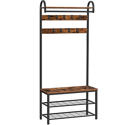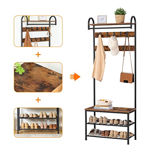 PERFETTO ORGANIZZATORE: Ci sono due file di ganci regolabili alla parte superiore, in modo da poterli utilizzare a piacere. È dotato 2 ripiani portascarpe in basso, contiene fino a 6/8 paia di scarpe, il piano può contenere le cornici per foto o le tue decorazioni. L’appendiabiti è pratico