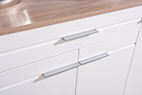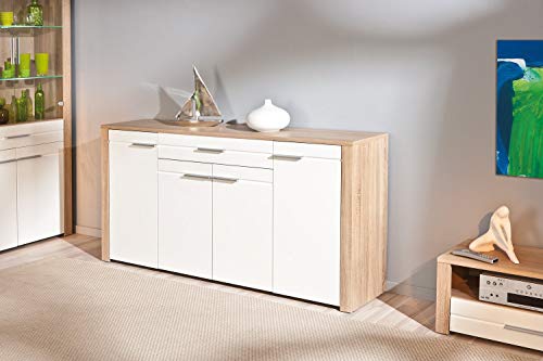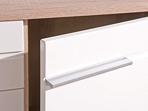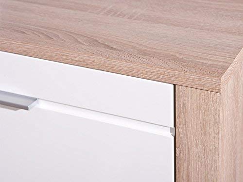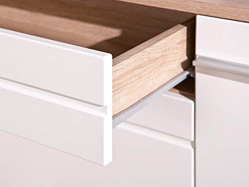 Truciolare, superficie melaminica, decoro rovere di Sonoma, ante bianche lucide in MDF fibra di legno a media densità, cassetti su guide scorrevoli