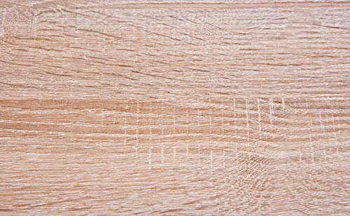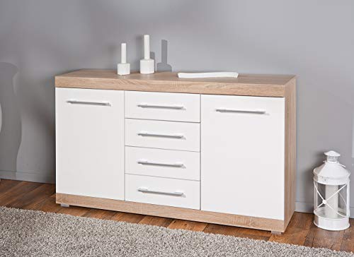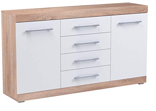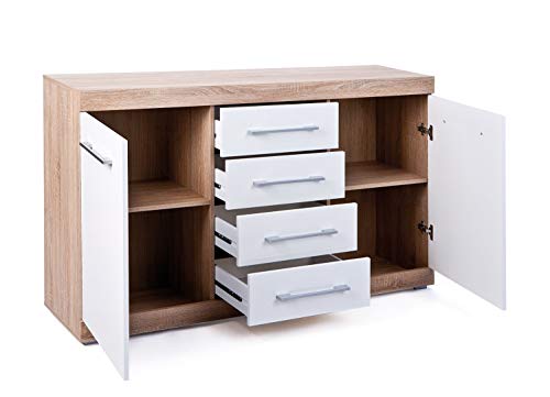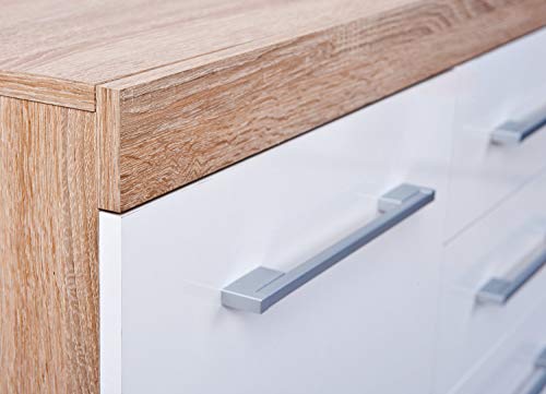 Truciolare, superficie melaminica, decoro rovere di Sonoma, facciate bianche lucide, cassetti su guide scorrevoli