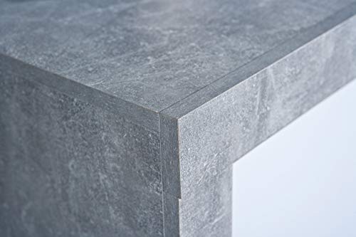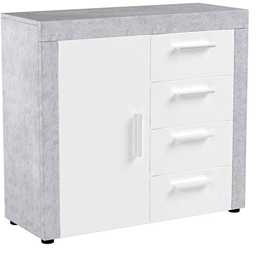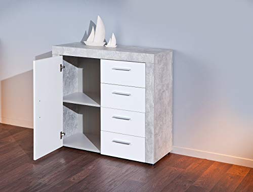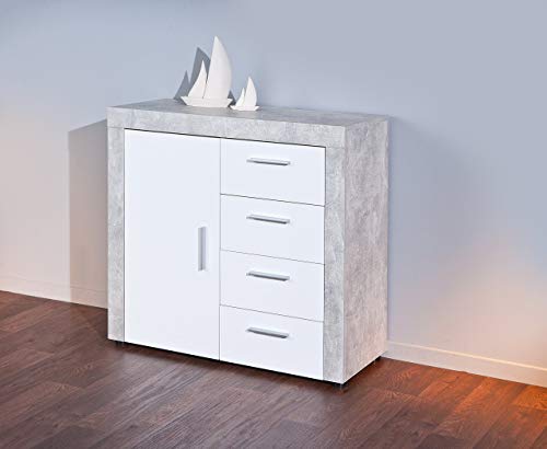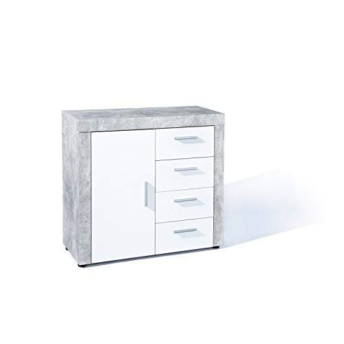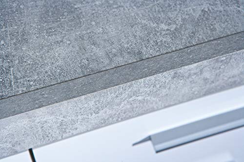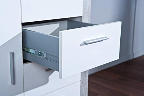 Cassettiera certificata FSC, PP truciolare, superficie melaminica, decoro cemento grigio chiaro e ante bianche lucide in MDF, pannelli di fibra di media densità, cassetti su guide scorrevoli