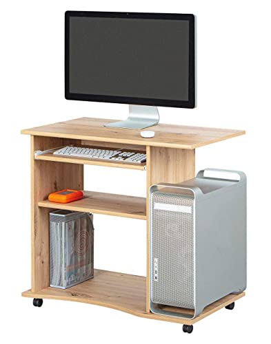 In pannello MDF rivestito in melamina. Ripiano estraibile per la tastiera con guide in metallo. Dotata di quattro ruote in plastica e bordi frontali stondati tranne quello in basso. Colore: Effetto rovere Artisan. Montaggio con attrezzi