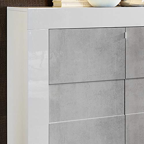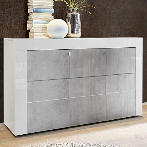 Dimensioni: L 138 x P 42 x H 84 cm. Credenza a 3 ante bianco laccato lucido e decorazione cemento. Lacca High Gloss. Maniglie in metallo laccato bianco. Pannelli agglomerati di legno spessore 16 mm. Porte 16/22 mm. Provate per questo buffet a 3 ante Brooklyn 2 con la sua splendida facciata in rilievo e il suo effetto cemento di una resa eccezionale. Numerosi scomparti, look di design, prezzo contenuto. Prodotto italiano.