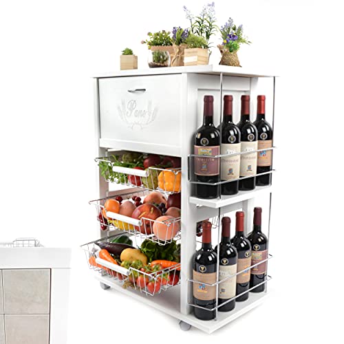 [ Design ] : Carrello porta frutta dal design semplice e moderno, con la ruote per poterlo spostare e usare dove e quando ti sarà più comodo. Grazie ai 3 cassetti più il cassetto porta pane puoi salvare tanto spazio in cucina o in sala da pranzo. Il carrello porta frutta e verdura è previsto di un ripiano multiuso sul quale potrai mettere la macchina per la pasta, un microonde o le tue Piantine.