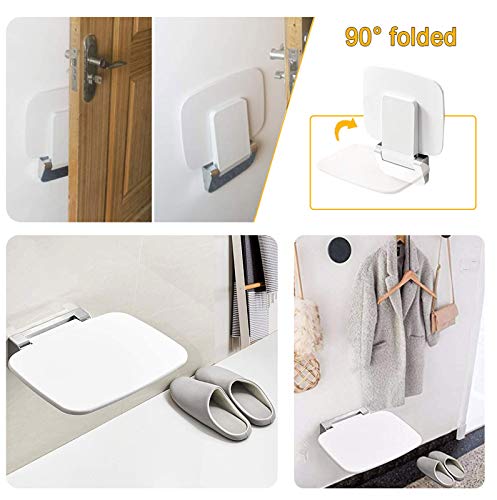 Uso pieghevole a 90 °: lo sgabello da doccia a parete ha un albero tampone che assorbe gli urti, che può essere facilmente appoggiato e ha un effetto silenzioso, risparmiando spazio, lo spessore piegato è di 4,9 cm e può essere facilmente nascosto, ideale per piccoli bagni o bagni con doccia.