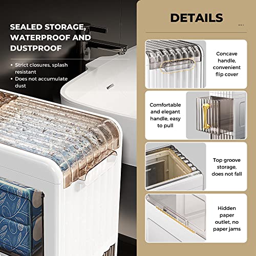 DESIGN: La torre di stoccaggio ha una maniglia integrata che rende l’apertura e la chiusura davvero facili e comode. È progettato con una fessura nascosta per posizionare rotoli di carta senza rischio di inceppamenti.