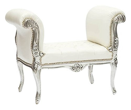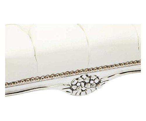 Panchetta con robusta struttura in legno rifinita in foglia argento, comoda seduta rivestita in ecopelle di colore bianco, il tutto delineato da una bordatura di borchiette