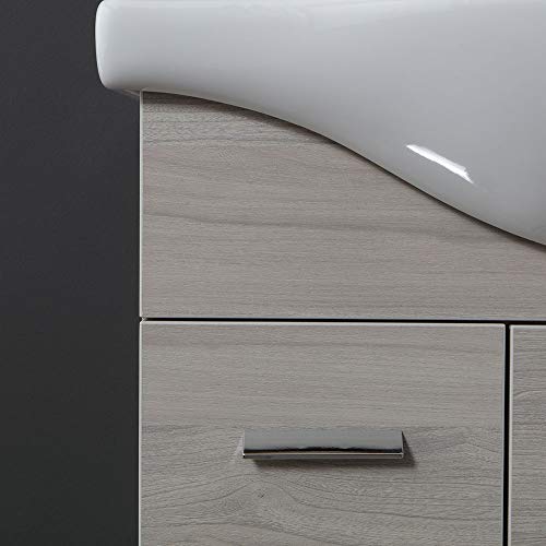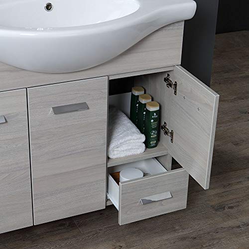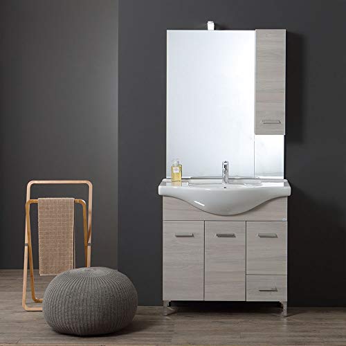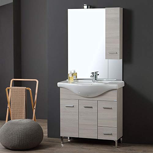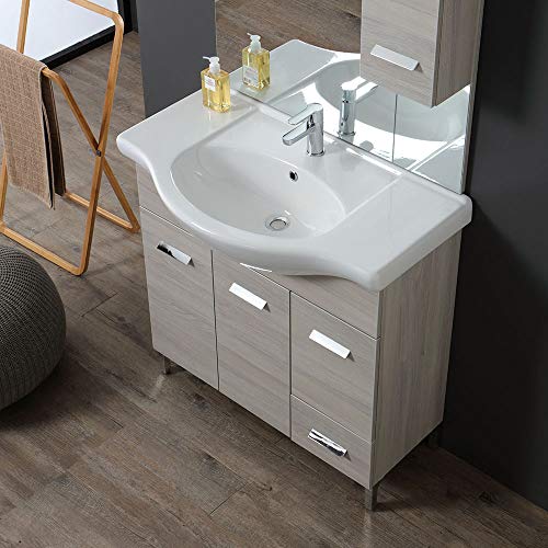 MOBILE BAGNO ROVERE BIANCO CON PIEDINI E MANIGLIE CROMATE Kiamami Valentina, arredo e accessori per il bagno, propone questo mobile bagno con piedini nella delicata finitura rovere bianco. Questa composizione ha uno stile tradizionale, ed è composta da una base con lavabo in ceramica e uno specchio con pensile. La base assicura la massima capacità contenitiva grazie alle 3 ante e al cassetto inferiore che ha una larghezza di 27 cm ed è alto 17 cm. Il lavabo in ceramica dispone di un’ampia