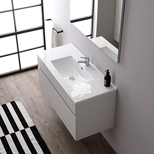MOBILE BAGNO SOSPESO DA 100 CENTIMETRI CON CASSETONE IN LEGNO BIANCO Questa composizione sospesa per il bagno larga 1 metro è resa particolarmente luminosa e moderna dalla prestigiosa finitura promenade, un bianco/grigio che lascia intravedere delicatamente le venature del legno. DIMENSIONI: Base: L. cm 100 P. cm 46 H. cm 50 Lavabo: L. cm 100 P. cm 46 H. cm 2 Pr. vasca cm 10,5 Specchio: L. cm 100 SP. cm 2,5 H. cm 70 MATERIALI: STRUTTURA E SCOCCHE: Pannello in legno truciolare n