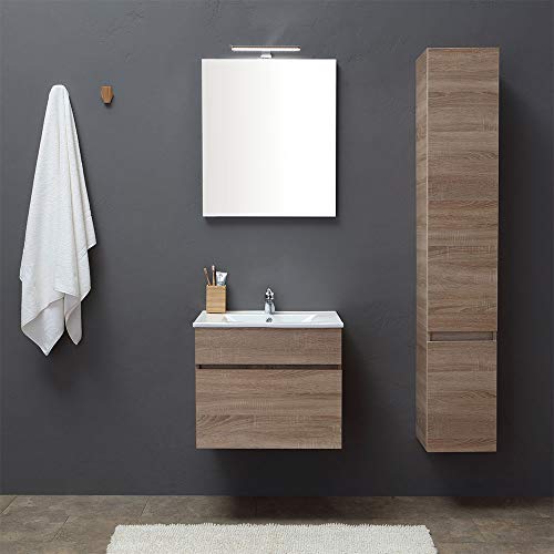 COMPOSIZIONE BAGNO SOSPESA CON SPECCHIO E LAVABO IN CERAMICA DA 60 CM I moderni mobili bagno della serie sole sono disponibili nel catalogo di KV Store in diverse misure e nelle finiture rovere e promenade, un grigio chiaro con venature. Trovate la proposta che fa per voi e potrete acquistarla in pochi click ad un prezzo veramente vantaggioso! DIMENSIONI: Base: L. cm 60 P. cm 46 H. cm 50 Lavabo: L. cm 60 P. cm 46 H. cm 2 Pr. vasca cm 10,5 Specchio: L. cm 60 SP. cm 2,5 H. cm 70 M