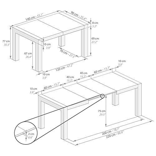 TAVOLO MODERNO: Chiuso 140 cm, si apre al centro, con un’allunga 180 cm, con 2 allunghe 220 cm (fino a 10 posti). Le allunghe sono riponibili sotto al piano del tavolo. La continuità della vena della finitura NON è garantita (nel piano e tra le allunghe e il piano).