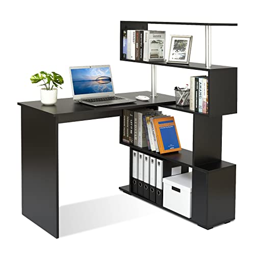 [Spazio ampio da uso] – Scrivania per computer con una combinazione di libreria e scrivania, con una scrivania sovradimensionata per un computer, monitor e stampante. Il ripiano a forma di S a 4 livelli è ideale per riporre libri, cartelle, giocattoli, ornamenti, ecc.; il ripiano può anche essere usato indipendentemente.