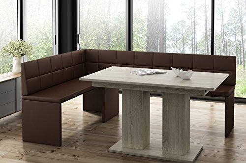Panca ad angolo: altezza seduta 51 cm, profondità seduta 39 cm e altezza schienale 38 cm con lunghezza 142 x 196 (sinistra) cm, questo angolo di seduta offre una sensazione di seduta sufficiente. Tavolo allungabile a colonna; piano del tavolo in MDF lucido. Altezza: circa 75 cm. Larghezza: circa 80 cm, lunghezza: 130-170 cm.