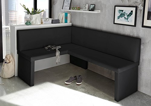 Moderna panca ad angolo completamente rivestita in ecopelle nera, resistente, facile da pulire, durevole, robusta, di alta qualità, resistente all’abrasione e accogliente. La panca ad angolo è completamente imbottita con schiuma poliuretanica e un rivestimento sullo schienale. Elevato comfort di seduta e molto confortevole.