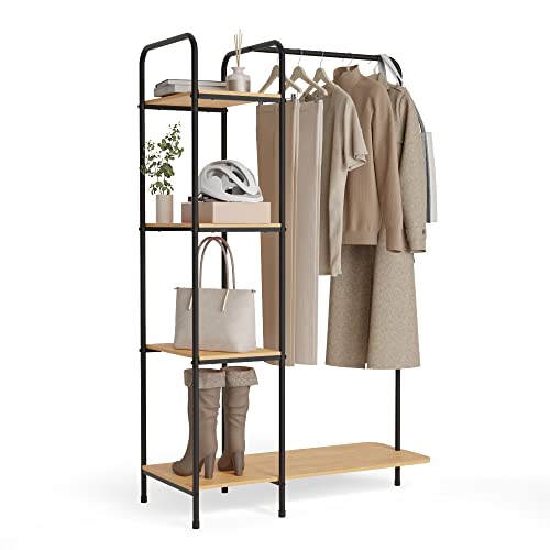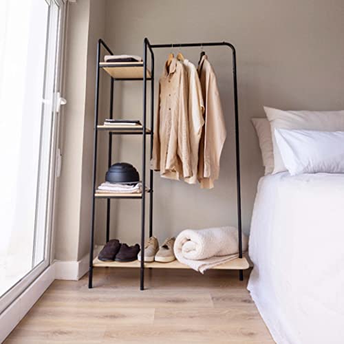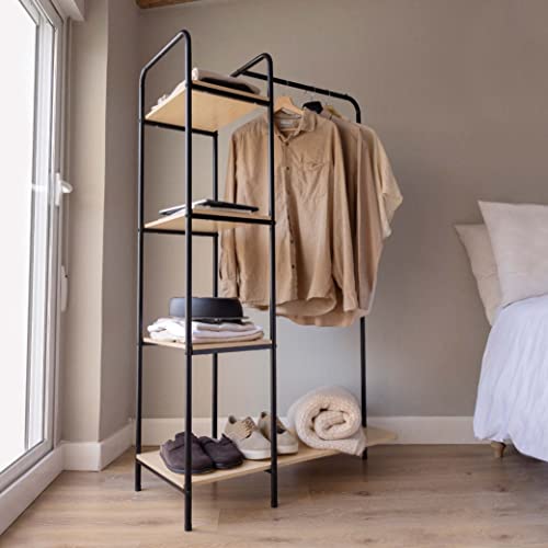 DESIGN COMPATTO CON GRANDE SPAZIO DI STOCCAGGIO distribuito in 4 altezze. Con dimensioni di 92 x 42 x 150 cm (larghezza x profondità x altezza), l’asino resistente dispone di uno spazio di 139 cm per appendere abiti lunghi e 4 ripiani in legno di grandi dimensioni (42 x 28 cm).