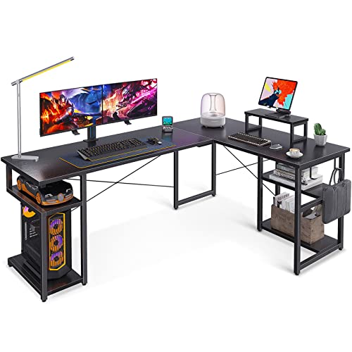 【Grande spazio di archiviazione extra】: Questa scrivania ad angolo in forma di L è dotata di un supporto per PC, un ripiano per riporre, un ripiano a due livelli, un supporto per monitor e 2 ganci in ferro, offrendo abbastanza spazio per una torre del computer desktop. Abbondante spazio per studiare, lavorare e giocare.