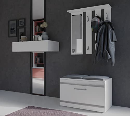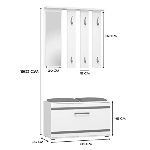 👉 Armadio da ingresso: L’ampio armadio da ingresso offre una soluzione facile da montare e adatta a qualsiasi corridoio. Dispone di: sei appendiabiti, mensola, scarpiera e una comoda seduta con cuscini e specchio.