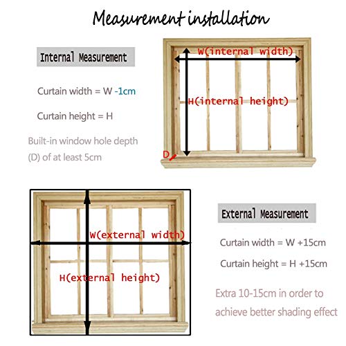 ▲ Installazione semplice: come mostrato.Installazione interna (larghezza ciechi = W – 1 cm; altezza ciechi = h cm);Installazione esterna (larghezza dei tapparelle = W + 15 cm; altezza dei tapparelle = H + 15 cm).